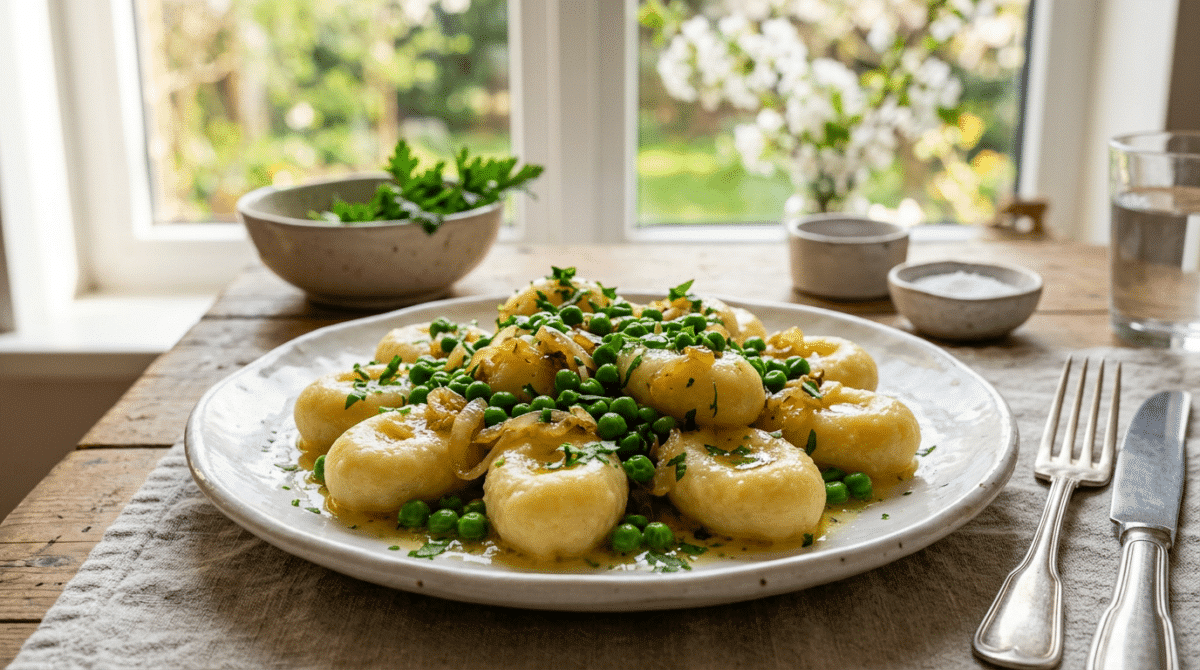 Są takie dni, kiedy chodzi za mną coś swojskiego, śląskiego i konkretnego, ale totalnie bez stania pół dnia w kuchni. Te kluski śląskie z zielonym groszkiem robię trochę „na skróty” (w najlepszym sensie): wykorzystuję ugotowane wcześniej ziemniaki, więc na talerzu lądują właściwie od ręki. Wychodzą miękkie, sprężyste, z tą klasyczną dziurką, a groszek robi tu całą wiosnę — maślany, lekko słodki i świeży.
