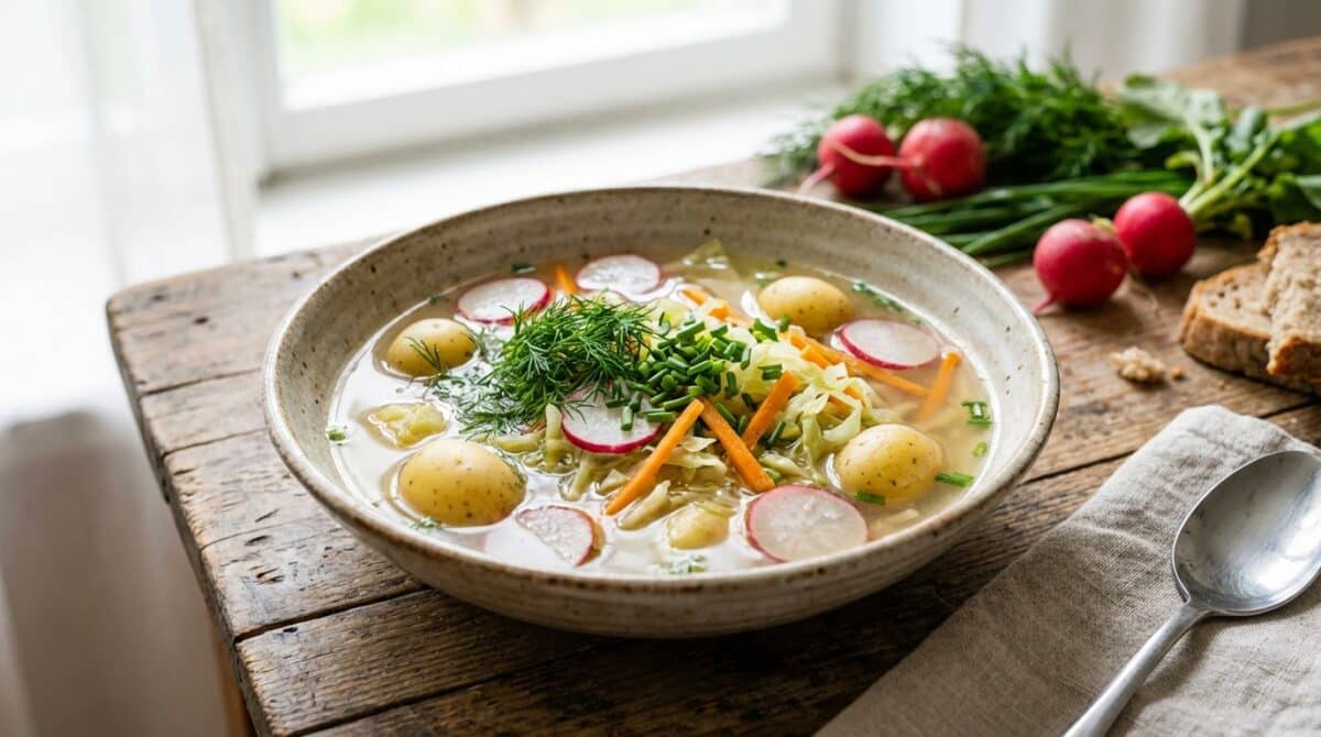 Wiosną zawsze mam ochotę na zupę, która po zimie dosłownie stawia na nogi — lekką, pełną młodych warzyw i z taką przyjemną kwasowością, od której od razu robi się raźniej. Tę wersję wymyśliłam z myślą o pierwszych pęczkach rzodkiewek, młodej marchewce i wszystkich tych zielonych liściach, które aż szkoda wyrzucać. Smakuje jak szybki spacer po targu w słońcu, kiedy wracasz do domu z siatką świeżych rzeczy i nie możesz się doczekać gotowania.